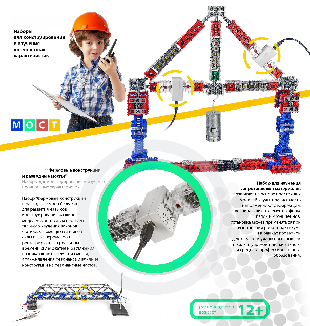 Демонстрационный набор «Фермовые конструкции и разводные мосты» предназначен для сборки моделей мостов, в том числе и разводного моста, экспериментального изучения статики на основе измерения усилий сжатия и растяжения, возникающих в элементах моделях мостов, измерения резонансных частот колебаний моделей мостов и влияния на них геометрических и конструкционных характеристик.