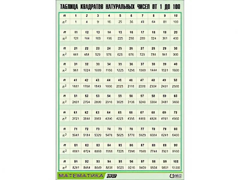 Таблица демонстрационная "Таблица квадратов натуральных чисел от 1 до 100"