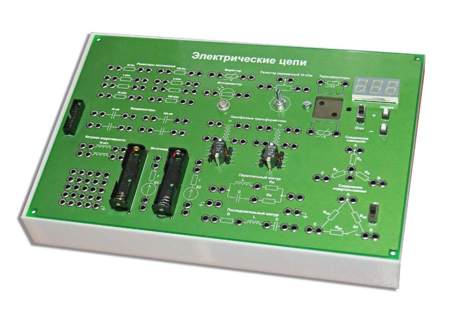 Сменная панель содержит необходимые объекты исследований в виде набора резисторов различных номиналов, нелинейного, переменного, термо- и фото- зависимого резисторов, набора конденсаторов, индуктивностей, трансформаторов, электрохимических источников ЭДС, а также функциональные узлы: параллельный и последовательный контура, эквиваленты активной трехфазных нагрузок включенных по семе «звезда» и «треугольник».