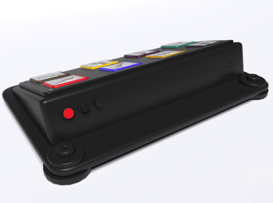 8-ми кнопочный многоуровневый игровой коммуникатор предназначен для развития детей, имеющих проблемы со слуховым, тактильным, зрительным восприятием и коммуникацией (аутизм, ДЦП). Представляет собой прямоугольный корпус, задняя часть которого слегка возвышена над передней под плавным углом, на котором размещены 8 кнопок с окошками для подписанных демонстрационных карточек. Изготовлено из высококачественного ударопрочного пластика, имеет обтекаемые плавные формы без острых краёв и углов. Есть возможность подключения до 4-х выносных кнопок.