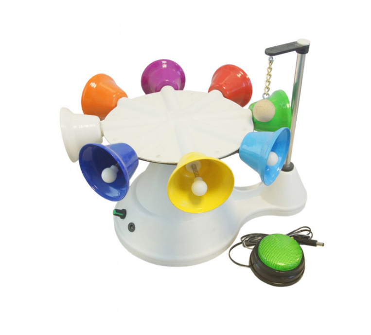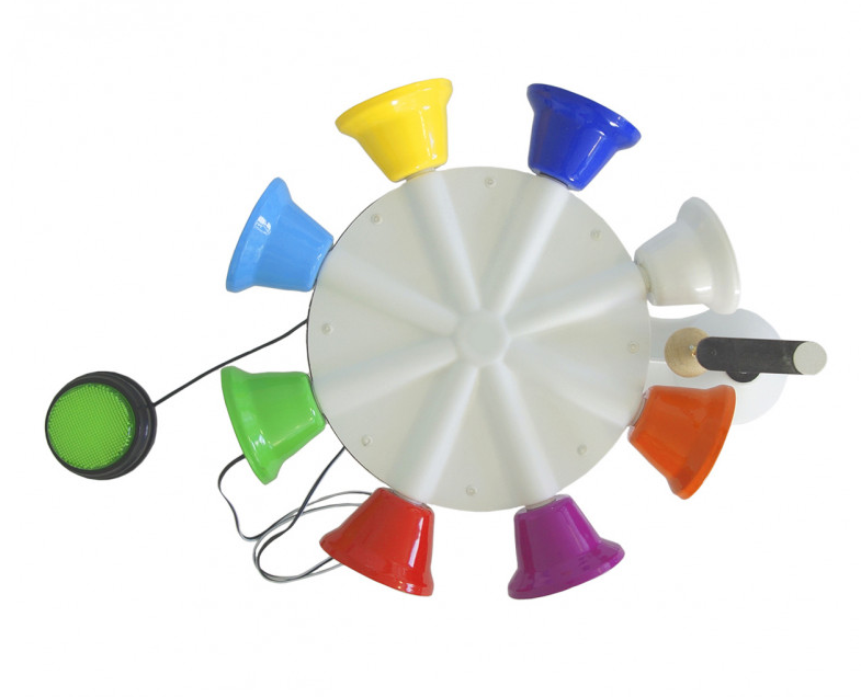 Музыкальная карусель – это механическое устройство, на корпусе которого расположены приборы управления (кнопка активации, регулятор скорости вращения, разъем для подключения дистанционной кнопки). На верхней части карусели, расположен вращающийся элемент на котором расположены съемные колокольчики  в количестве 8 шт. Сбоку есть вертикальный шток, на выносном кронштейне которого закреплен шар, при вращении площадки с колокольчиками он ударяется о корпус колокола, который в свою очередь издает звонкую мелодию. Все колокольчики имеют разный окрас, а также разную мелодию звучания. В комплект входит дистанционная кнопка.