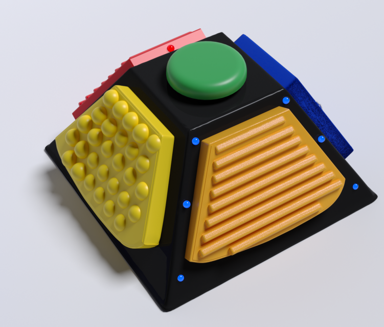 Представленный настольный развивающий центр предназначен для развития детей с ОВЗ. Представляет собой пирамиду, на вершине которой расположена кнопка; на каждой грани пирамиды имеются кнопки с разной текстурой, различающиеся по цвету, на одной из кнопок - встроенные цепочки из бусинок. Вокруг кнопок встроены разноцветные светодиодные огоньки. Изготовлено из высококачественного ударопрочного пластика, имеет обтекаемые плавные формы без острых краёв и углов.