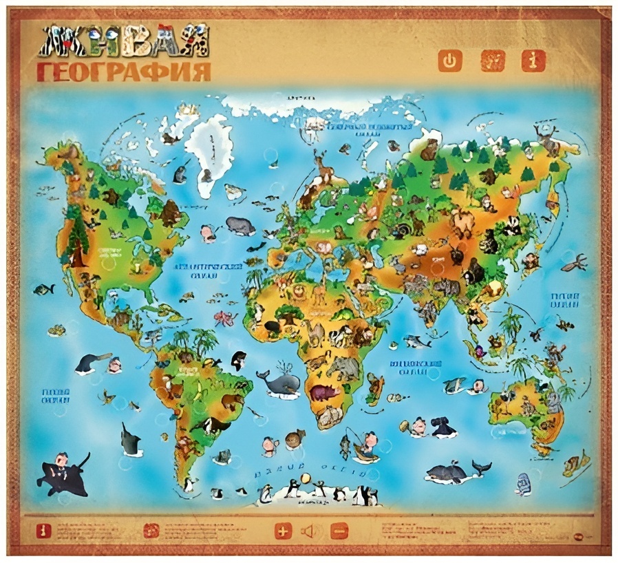 - ЗВУКИ: после включения этой кнопки, нажимая кнопки рядом с животными или географическими объектами, звучат названия и звуки, которые издают животные.
