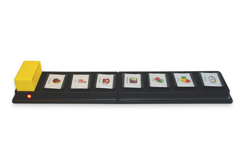 Обучающий семикнопочный настенный игровой коммуникатор со съемными символами, это программируемое устройство предназначенное для записи и воспроизведения голосовых сообщений. Устройство имеет вертикальную конструктивную плоскость с 7 кнопками-карманами, которые в свою очередь могут отстегиваться (кнопки крепятся к поверхности на липучке). В карманы можно вставлять различные тематические карточки, и нажимая на них записывать/воспроизводить голосовые сообщения.