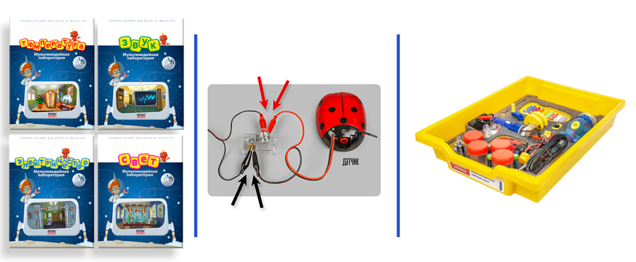 В ходе занятия с комплектом дети проводят эксперименты с использованием мультидатчика в виде «божьей коровки», а мультимедийный интерактивный герой Наураша ставит ребенку задачи и комментирует результаты экспериментов.