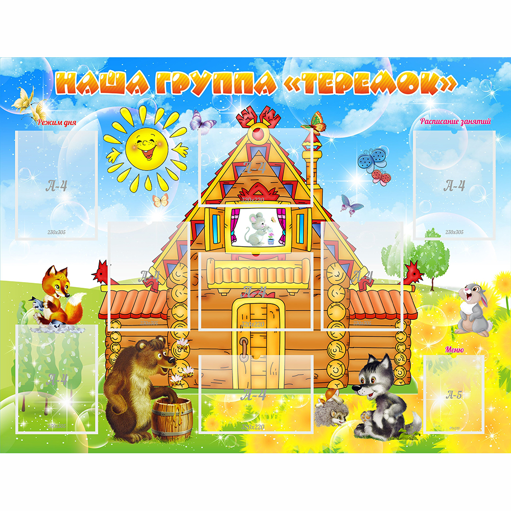 Кто, кто в теремочке живёт? Для ответа на этот вопрос детям придется приложить немало усилий. Пользуясь солнечным днём, обитатели теремка высыпали на поляну и занимаются своими делами. Да еще бабочек налетело - не сосчитать! Забавный дизайн этого стенда надолго привлечёт внимание детей. Д а и их родители не останутся равнодушными.