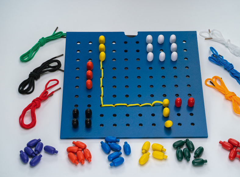 Модуль № 12 (J2) включает отсортированные по цвету фигурки на ножках и комплект шнурков (мозаика, шнуровка). Развивает зрительно-моторную координацию.