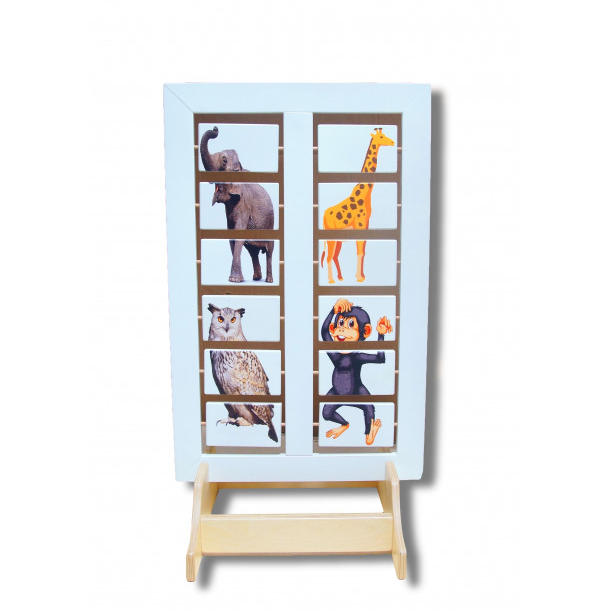 Напольная развивающая панель о мире животных №2 изготовлена из натурального дерева с трехступенчатым шлифованием и безопасным покрытием красками и лаком. Панель состоит из двухсторонних секций, в каждой из которых размещены вращающиеся таблички с изображениями частей животных и птиц. Принцип действия - ребенок, вращая таблички по очереди, составляет изображения животных и птиц методом подбора. Такая игра помогает развивать оба полушария мозга одновременно, задействуется логическое и критическое мышление.