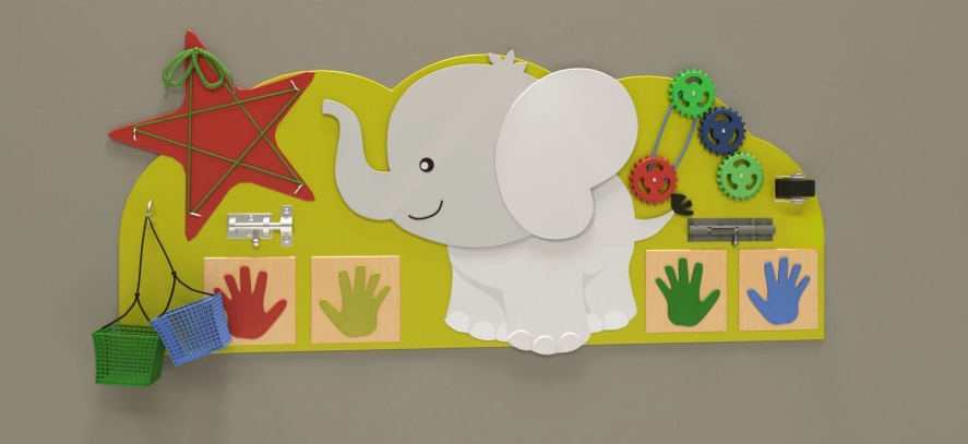 Настенная панель со слоником — это детский игровой модуль. Основание его выполнено в виде яркого салатового «облачка», на котором размещён задорный дружелюбный Слоник и разнообразные детали для весёлой игры. Поверхность обработана специальным образом и имеет многослойное покрытие из экологически безопасных материалов.
