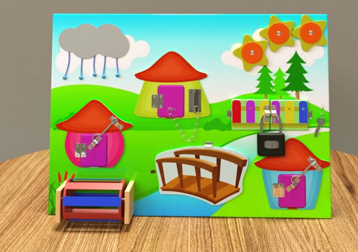 На деревянной панели размещены домики с дверцами, за которыми кто-то прячется, а также открывающиеся ворота на замочке, тучка с тактильным дождиком, звёздочки-шестерёнки, «водяная мельница» и другие приспособления для игры. Поверхность отшлифована и покрыта безопасными лаком и краской.