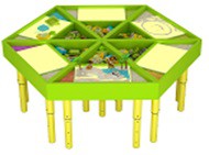 6 треугольных приставных столика — трансформера. Столы имеют световой планшет для рисования песком, а так же, три отсека: Для песка, формочек и игрушек. Материал ЛДСП. Подсветка световых планшетов - 16 цветов 3 режима. Ножки телескопические c регулировкой высоты.