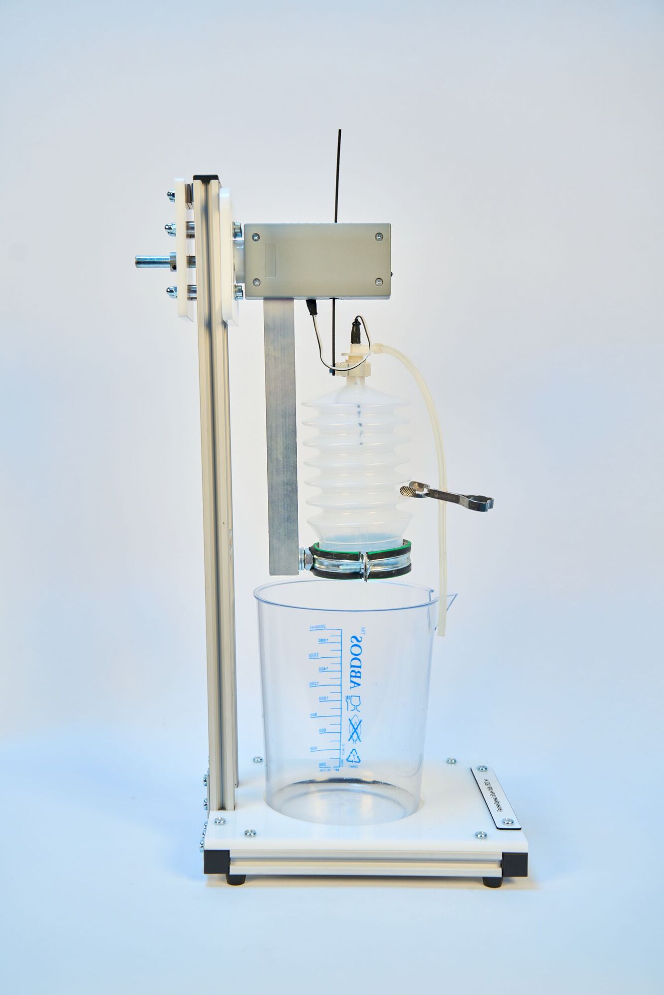 Лабораторная установка представляет собой герметичный резервуар, который смонтирован на вертикальной стойке таким образом, чтобы он мог быть погружен в резервуар с горячей или холодной водой. Герметичный резервуар имеет гофрированную боковую поверхность, обеспечивающую постоянство давления внутри резервуара за счет изменения его длины. Одно из оснований герметичного резервуара жестко связано с подвижным элементом датчика объема. Электронная схема датчика объема и датчика температуры смонтирована в едином корпусе. Датчик температуры обеспечивает измерение температуры газа, который находится в резервуаре. Квазистационарные условия изобарного процесса обеспечиваются при остывании предварительно нагретого резервуара на воздухе. Нагрев резервуара и, соответственно, находящегося в нем воздуха осуществляется при погружении его в горячую воду.