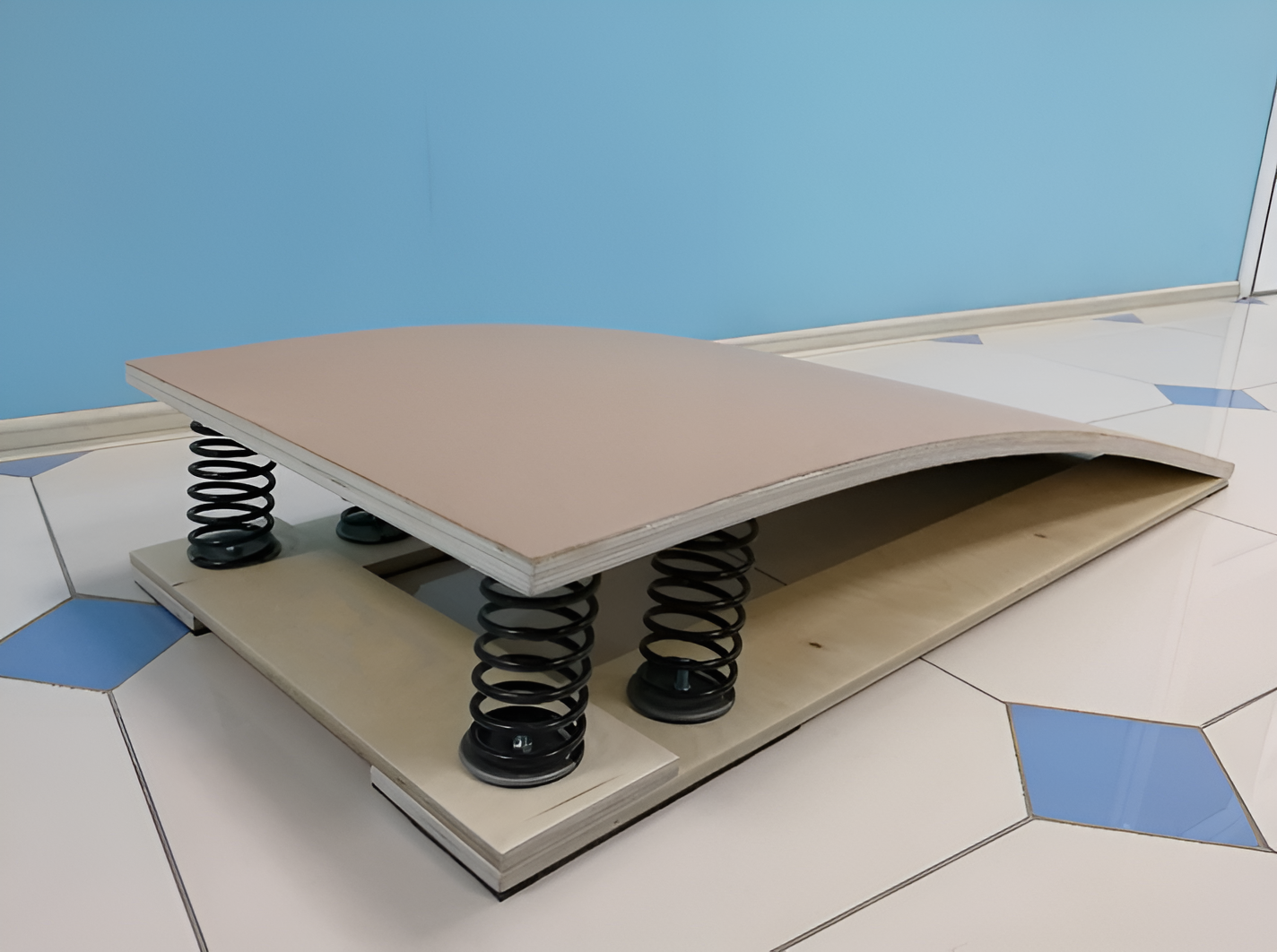 Представляет собой сборную конструкцию, состоящую из верхней площадки и основания (фанера 15мм), 4х стальных амортизирующих пружин, вставленных между верхней и нижней поверхностью мостика, обеспечивающих высокий отскок и прочность. Верхняя площадка изогнутой формы. Площадка имеет ковровое покрытие, препятствующее скольжение ног во время выполнения прыжков.
