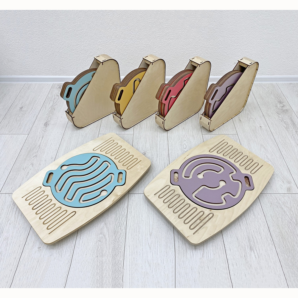 Благодаря заменяемости лабиринтов, игрушка просто универсальна! Дети могут играть отдельно с ручными лабиринтами или вставить их в балансир для ног и соревноваться в ловкости и скорости прохождения.