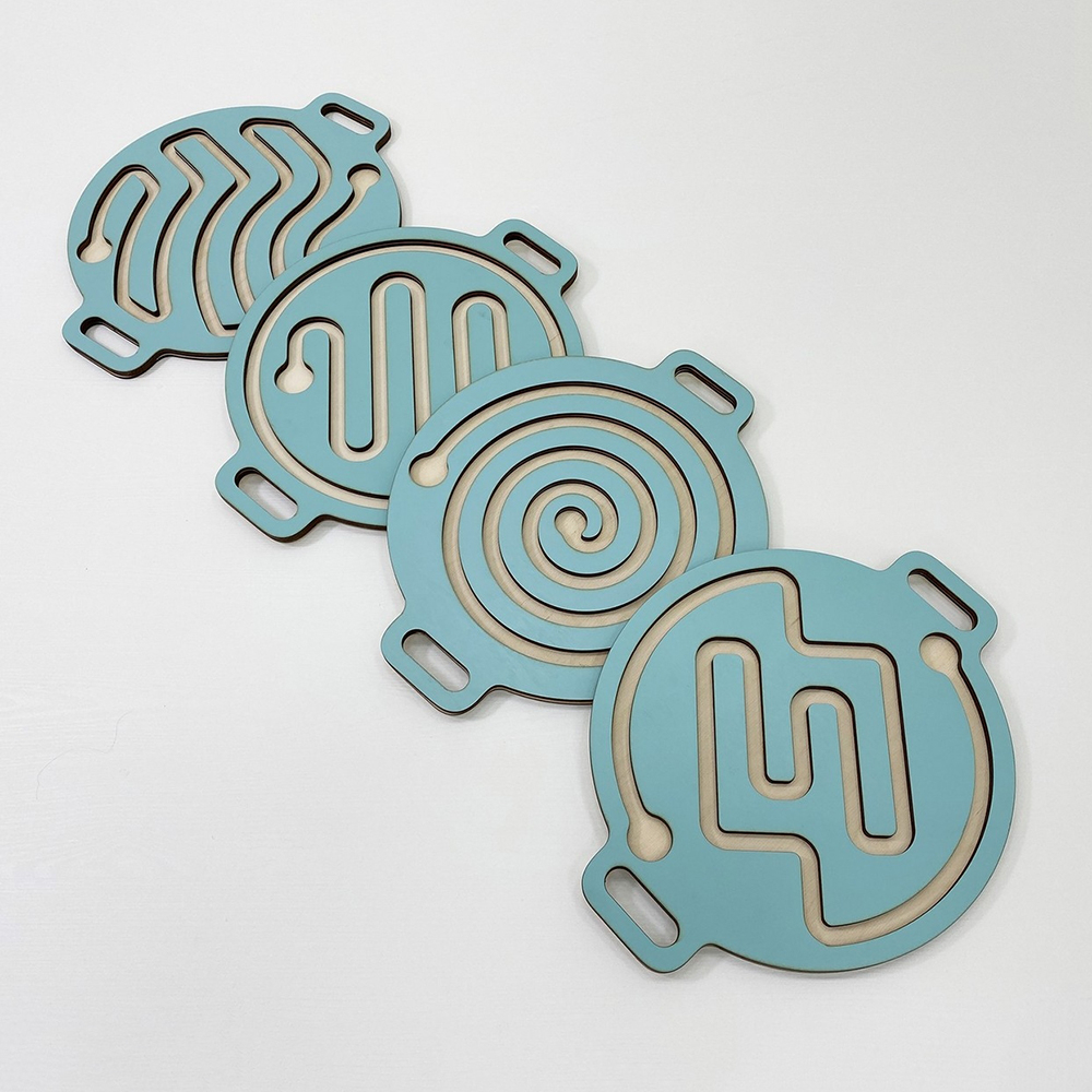 Благодаря заменяемости лабиринтов, игрушка просто универсальна! Дети могут играть отдельно с ручными лабиринтами или вставить их в балансир для ног и соревноваться в ловкости и скорости прохождения.