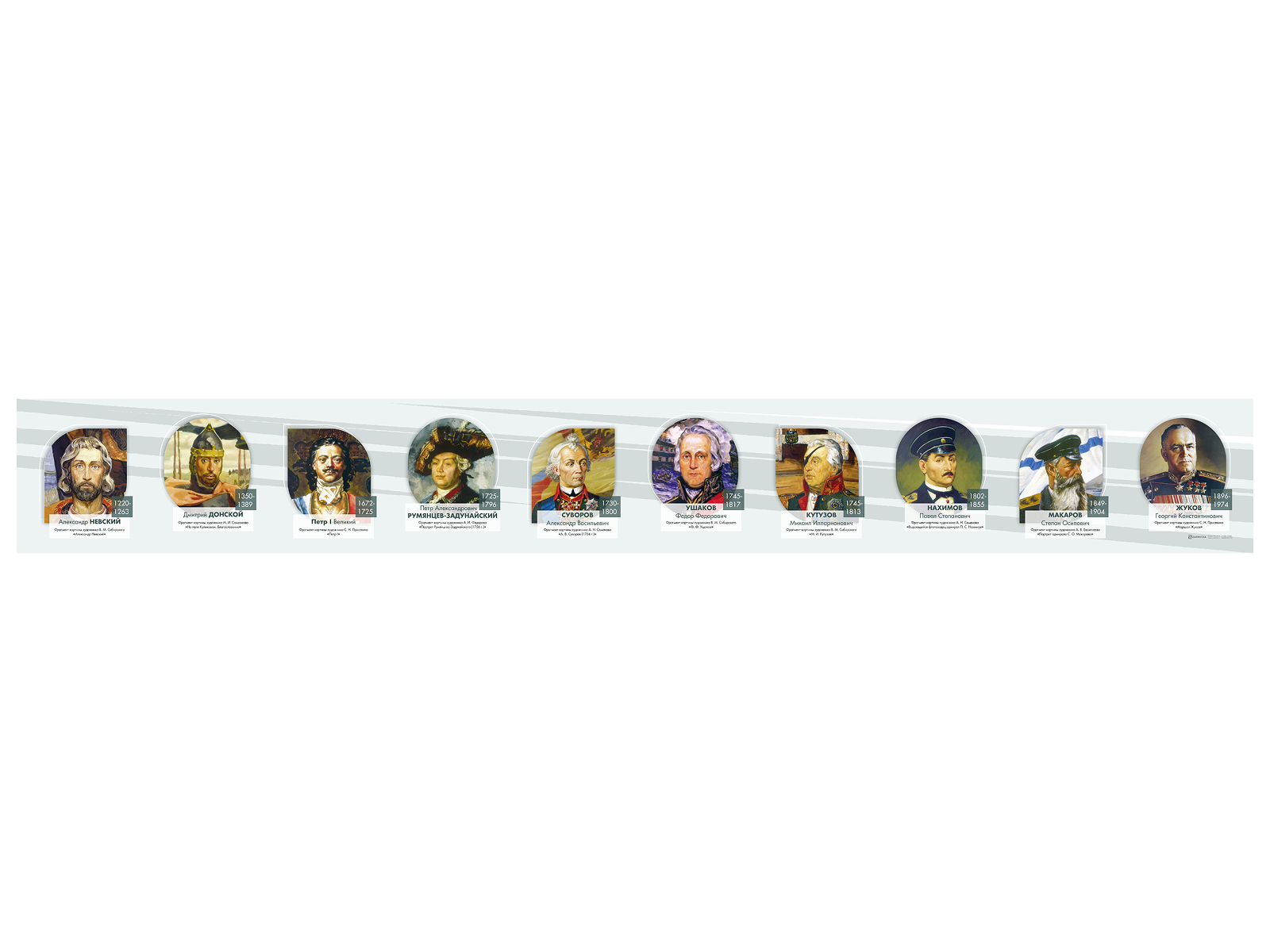 Стенд представляет собой информационную панель, на которой изображены портреты великих полководцев и флотоводцев России, на примере героических подвигов которых воспитано не одно поколение военнослужащих и патриотов.