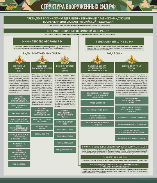 Стенд представляет собой информационную панель, на которой размещена структура Вооруженных сил РФ. Стенд предназначен для наглядного отображения информации о видах Вооруженных сил РФ, родах войск, а также для формирования у учащихся или курсантов осознанного отношения к военной службе.