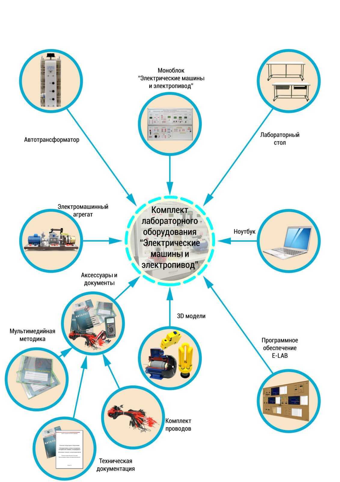 Основой учебной лаборатории является комплект лабораторного оборудования «Электрические машины и электропривод», который включает в себя лабораторный стол, ноутбук, моноблок «Электрические машины и электропривод», электромашинный агрегат, трехфазный автотрансформатор, набор аксессуаров и документов, комплект программного обеспечения, комплект 3D моделей.