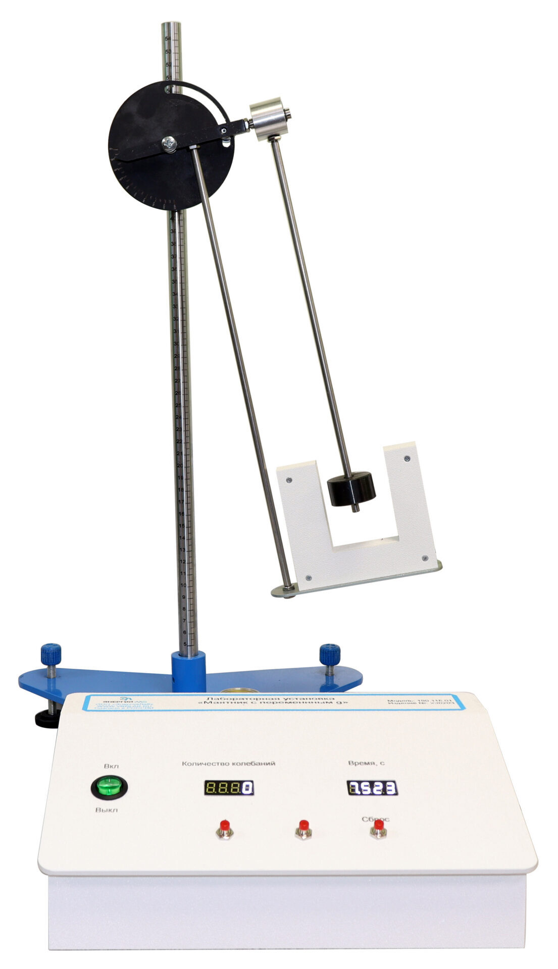 Лабораторная установка «Маятник с переменным g» представляет собой установленную на неподвижном основании вертикальную стойку с закрепленным диском с градуированной угловой шкалой. На оси с изменяемым углом наклона подвижно закреплен маятник. Изменяя угол отклонения маятника от вертикального положения, с помощью цифрового секундомера и оптического датчика измеряет изменение периода маятника.