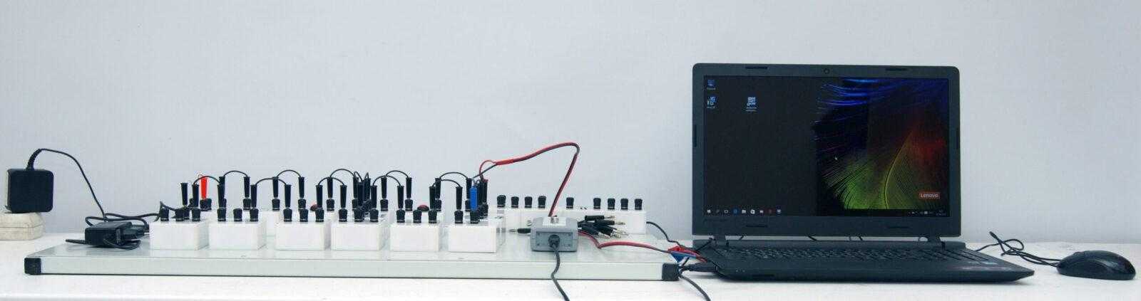 Электрическая цепь, представляющая собой цепь разряда конденсатора через резистор и цепь зарядки конденсатора, собирается на металлической платформе из элементов, смонтированных внутри закрытых со всех сторон пластиковых блоков с соответствующими обозначениями и магнитами на нижней поверхности. При выполнении лабораторных работ для изменения параметров цепи разряда часть элементов легко заменяется. Зарядка конденсатора, входящего в колебательный контур, осуществляется от источника питания. Измерение напряжений на элементах электрической цепи осуществляется с помощью цифрового осциллографического датчика. Наличие в цепи двух кнопочных выключателей обеспечивает отключение конденсатора от источника питания на время разряда его через резистор.
